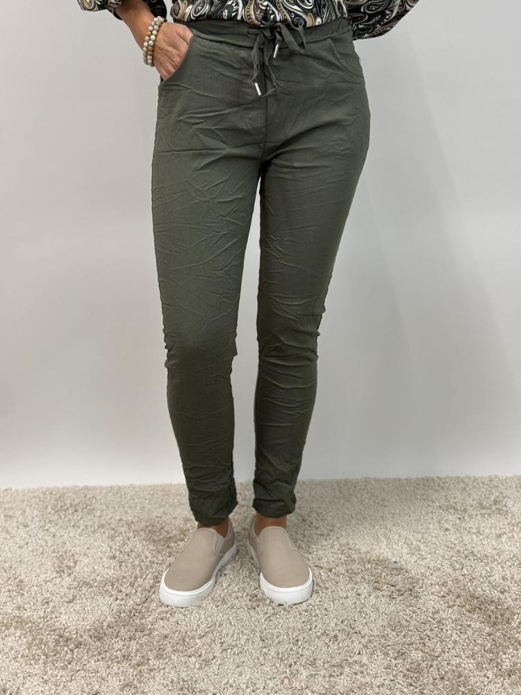Byxa armygrön stretch med knyt i midjan 77% viscose 20% polyester 3% elastan