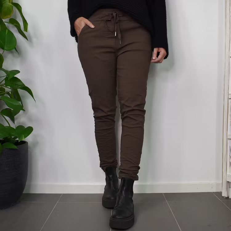 Byxa espresso stretch med knyt i midjan 77% viscose 20% polyester 3% elastan