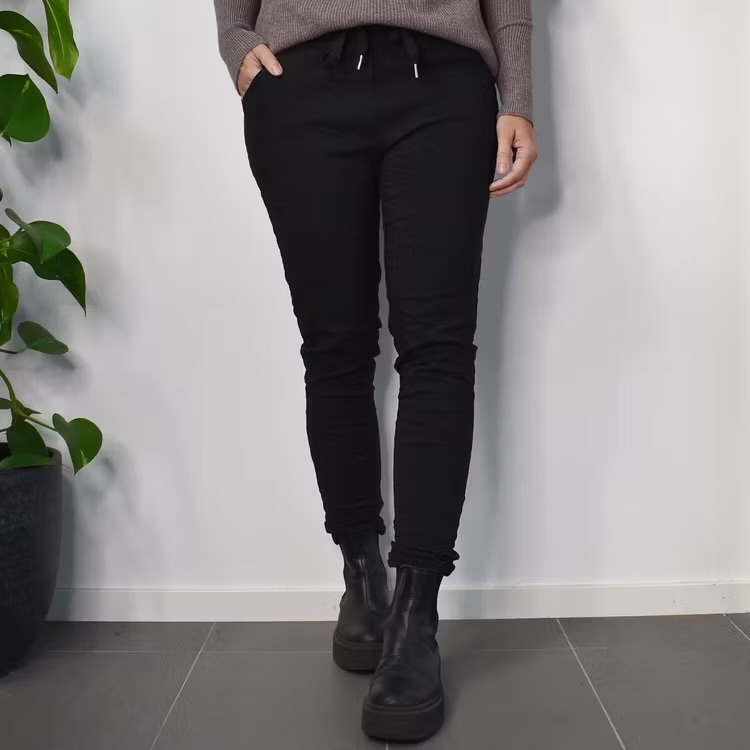 Byxa svart stretch med knyt i midjan 77% viscose 20% polyester 3% elastan